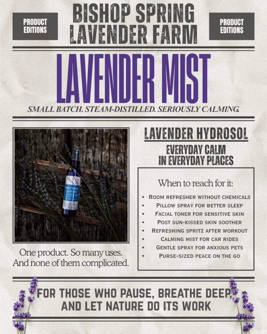 Made from pure lavender hydrosol, this light, fresh mist brings a soft, clean calm wherever it lands… on linens, in the air, or on your skin.